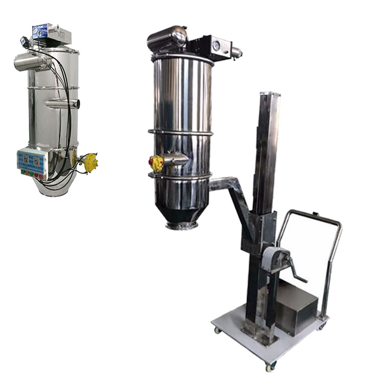 真空上料機(jī)又可以成為真空輸送設(shè)備,工作原理是用真空泵抽氣,使吸料嘴進(jìn)口處及整個系統(tǒng)處于一定的真空狀態(tài),粉粒料隨同外界空氣被吸入料嘴,形成料氣流,經(jīng)過吸料管到達(dá)料斗,在料斗中進(jìn)氣、料分離。分離后的物料進(jìn)入受料設(shè)備。送料、放料是通過氣動三通閥不斷地開、閉來完成的,而氣動三通閥的開閉是由控制中心來控制的。